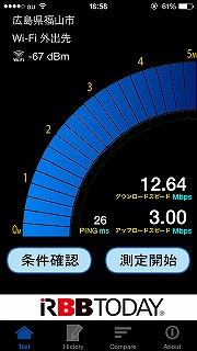 速度の計測は、スマホアプリの「RBB SPEED」でおこないました。